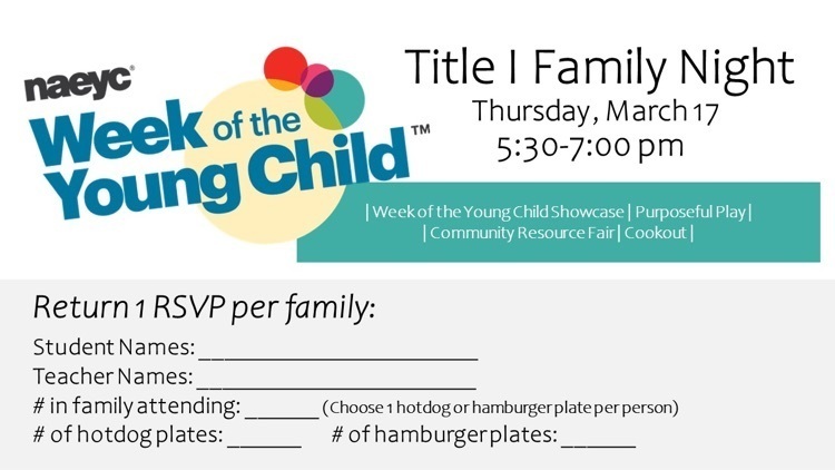 Wolfpack families, we are so excited about getting back to face-to-face with our Family Engagement Nights! Our first is scheduled for Thursday, March 17 as a celebration of Week of the Young Child! Invited were sent home with students today- please return RSVPs by THIS Friday (March 11). We hope you can join us!